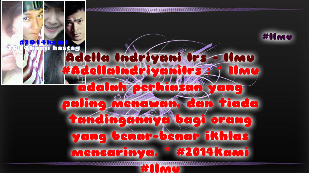 #AdellaIndriyaniIrs : “ Ilmu adalah perhiasan yang paling menawan, dan tiada tandingannya bagi orang yang benar-benar ikhlas mencarinya. ” #2014kami #Ilmu
